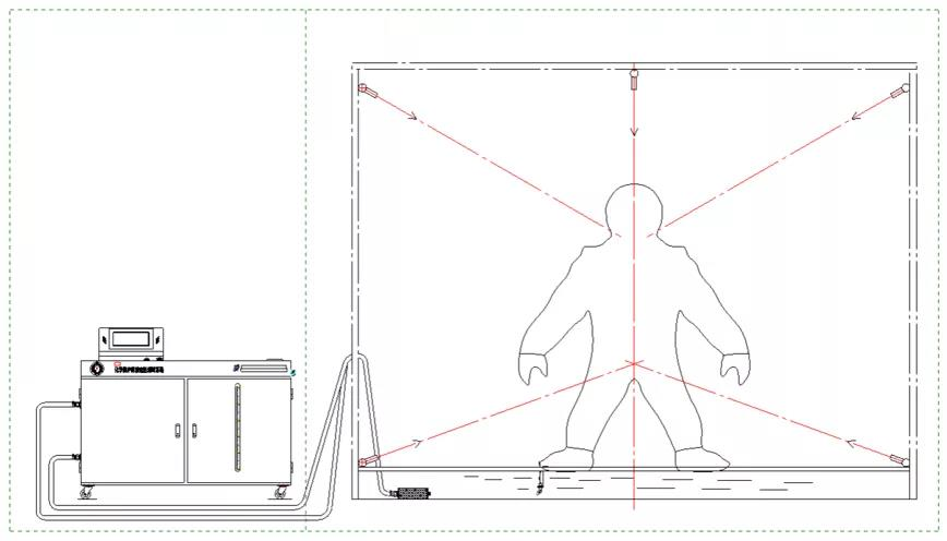化学防护服整体抗水渗漏性能测试系统主要由供液系统、喷液系统、防护结构等组成。